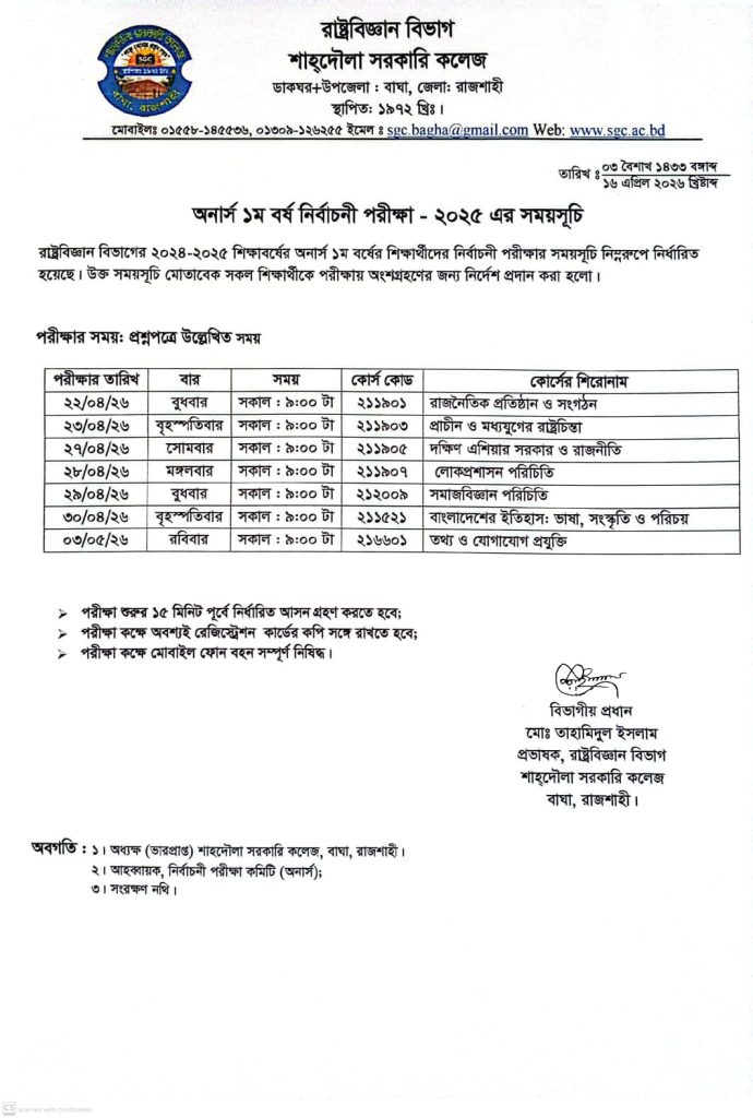 অনার্স ১ম বর্ষ নির্বাচনী পরীক্ষা ২০২৫ এর সময়সূচি।