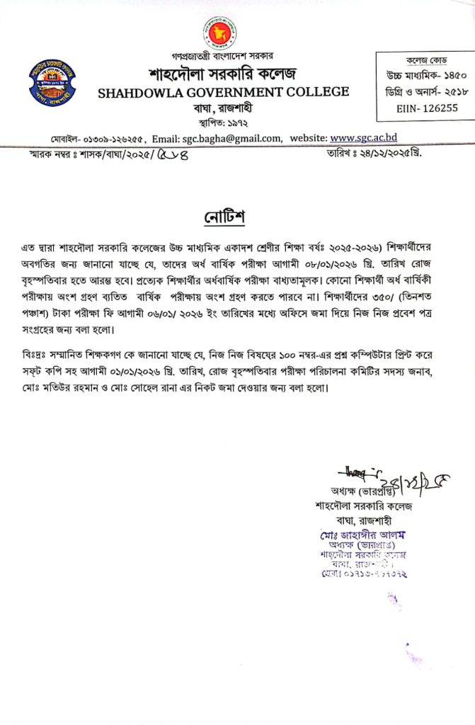উচ্চ মাধ্যমিক একাদশ শ্রেণীর শিক্ষা বর্ষঃ ২০২৫-২০২৬) শিক্ষার্থীদের অর্ধ বার্ষিক পরীক্ষা সম্পর্কিত নোটিশ ।