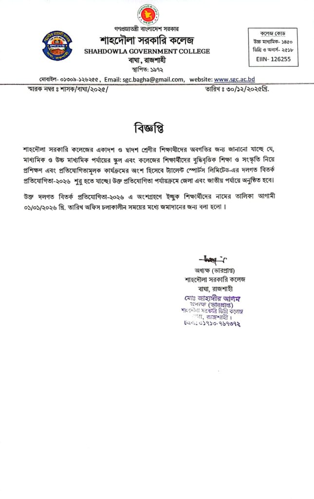 একাদশ ও দ্বাদশ শ্রেণীর শিক্ষাথীদের ট্যালেন্ট স্পোর্টস লিমিটেড-এর দলগত বিতর্ক প্রতিযোগিতা-২০২৬ সংক্রান্ত বিজ্ঞপ্তি।