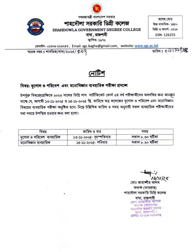 ভূগোল ও পরিবেশ এবং মনোবিজ্ঞান ব্যবহারিক পরীক্ষা প্রসঙ্গে নোটিশ।