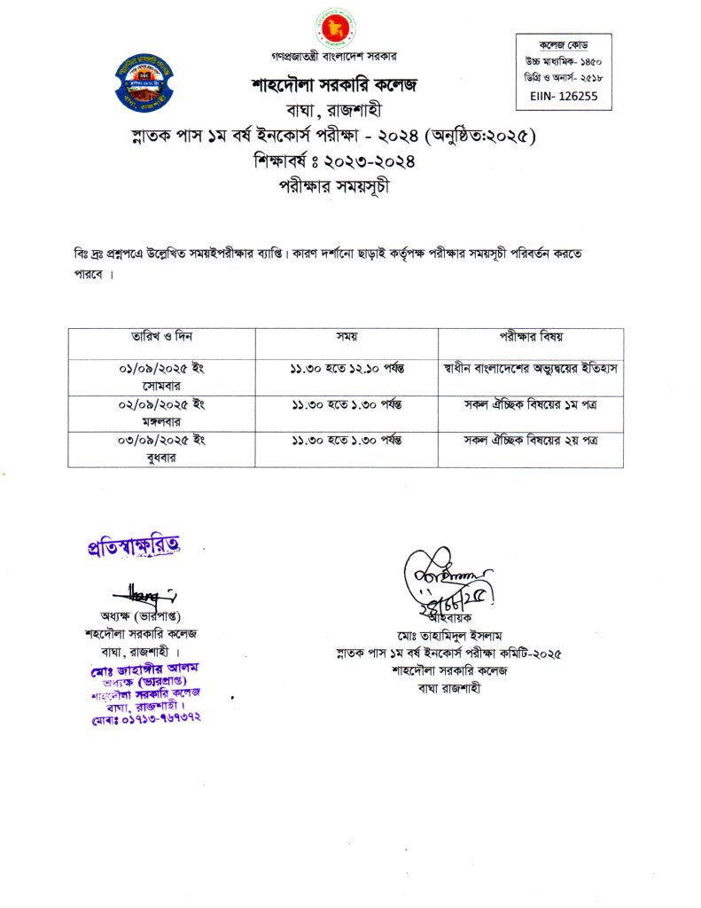 স্নাতক পাস ১ম বর্ষ ইনকোর্স পরীক্ষা- ২০২৪ (অনুষ্ঠিত: ২০২৫) এর পরীক্ষার সময়সূচী