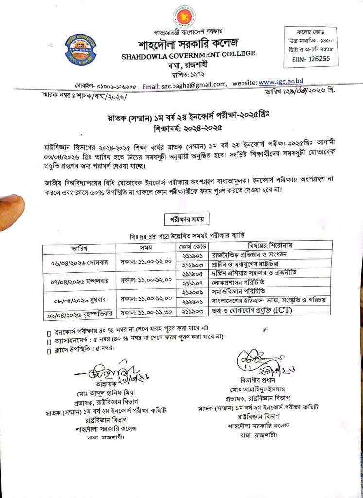 স্নাতক (সম্মান) ১ম বর্ষ ২য় ইনকোর্স পরীক্ষা-২০২৫খ্রিঃ শিক্ষাবর্ষ: ২০২৪-২০২৫