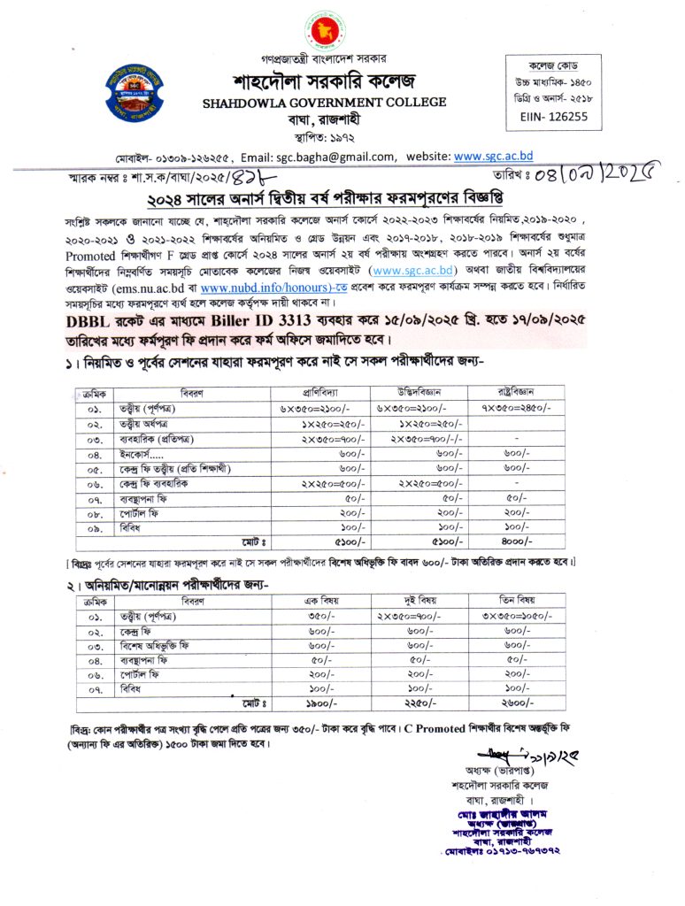 ২০২৪ সালের অনার্স দ্বিতীয় বর্ষ পরীক্ষার ফরমপূরণের সময় বৃদ্ধি করা হয়েছে যাহা আগামী ২৫/০৯/২০২৫ খ্রি. মধ্যে ফি প্রদান করে ফরম অফিসে জমা দিতে হবে ।