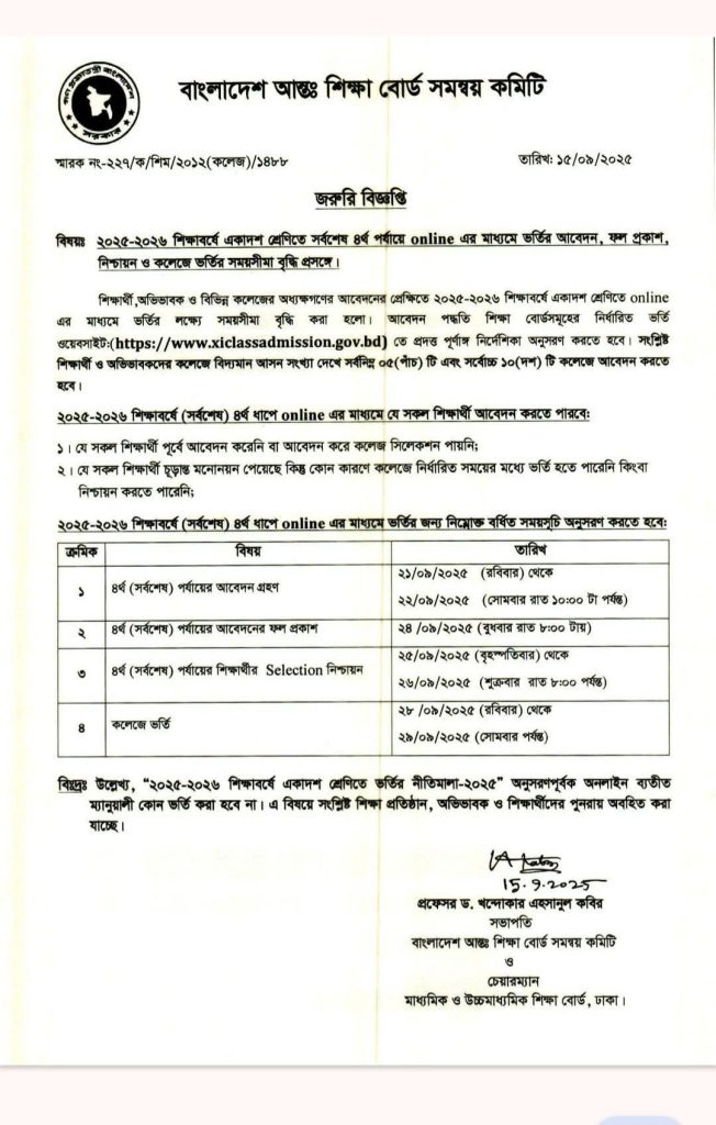 ২০২৫-২০২৬ শিক্ষাবর্ষে একাদশ শ্রেণীতে ভর্তির আবেদন এর সময়সীমা বৃদ্ধি